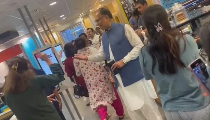 In the viral video, it could be seen that Ahsan Iqbal was inside the food restaurant and the people standing nearby were shouting slogans.